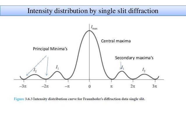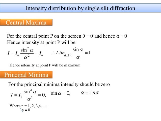 - 9. Intensity distribution by single slit diffraction Central maxima Secondary maxima’s Principal Minima’s