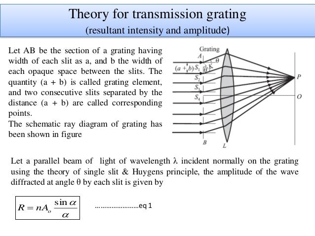- 13. Theory for transmission grating (resultant intensity and amplitude) Let AB be the section of a grating having width of each slit as a, and b the width of each opaque space between the slits. The quantity (a + b) is called grating element, and two consecutive slits separated by the distance (a + b) are called corresponding points. The schematic ray diagram of grating has been shown in figure sin onAR Let a parallel beam of light of wavelength λ incident normally on the grating using the theory of single slit & Huygens principle, the amplitude of the wave diffracted at angle θ by each slit is given by ……………………eq 1
