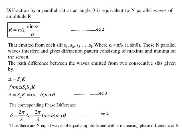 - 14. Diffraction by n parallel slit at an angle θ is equivalent to N parallel waves of amplitude R sin onAR That emitted from each slit s1, s2, s3 …..sN Where α = π/λ (a sinθ), These N parallel waves interfere and gives diffraction pattern consisting of maxima and minima on the screen. The path difference between the waves emitted from two consecutive slits given by. sin)(2 21 2 baKS KSSfrom KS The corresponding Phase Difference sin)( 22 ba Thus there are N equal waves of equal amplitude and with a increasing phase difference of δ ……………………eq 2 ……………………eq 3 ……………………eq 4