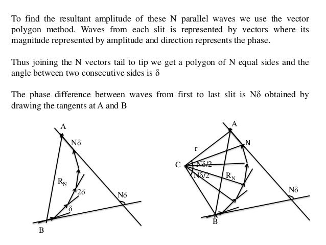- 15. To find the resultant amplitude of these N parallel waves we use the vector polygon method. Waves from each slit is represented by vectors where its magnitude represented by amplitude and direction represents the phase. Thus joining the N vectors tail to tip we get a polygon of N equal sides and the angle between two consecutive sides is δ The phase difference between waves from first to last slit is Nδ obtained by drawing the tangents at A and B Nδ Nδ/2 Nδ/2 A B C δ 2δ Nδ r Nδ A B RN RN N