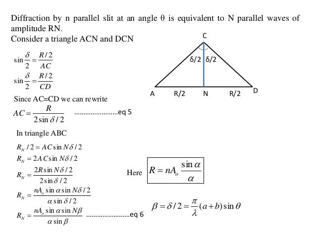 - 16. Diffraction by n parallel slit at an angle θ is equivalent to N parallel waves of amplitude RN. Consider a triangle ACN and DCN C A N D δ/2 δ/2 R/2 R/2 AC R 2/ 2 sin CD R 2/ 2 sin Since AC=CD we can rewrite 2/sin2 R AC ……………………eq 5 In triangle ABC sin sinsin 2/sin 2/sinsin 2/sin2 2/sin2 2/sin2 2/sin2/ NnA R NnA R NR R NACR NACR o N o N N N N ……………………eq 6 Here sin onAR sin)(2/ ba