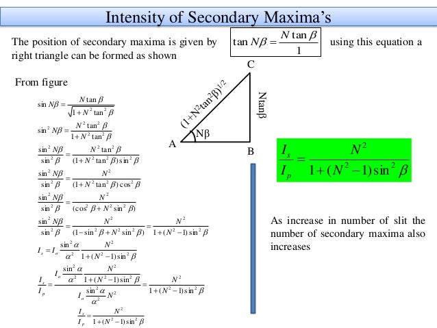 - 20. Intensity of Secondary Maxima’s The position of secondary maxima is given by using this equation a right triangle can be formed as shown 1 tan tan N N Nβ A B C Ntanβ From figure 22 2 2 2 2 22 2 2 2 22 2 2 2 22 2 222 2 2 2 222 2 2 2 222 2 2 2 222 22 2 2 22 22 2 22 sin)1(1sin sin)1(1 sin sin)1(1 sin sin)1(1)sinsin1(sin sin )sin(cossin sin cos)tan1(sin sin sin)tan1( tan sin sin tan1 tan sin tan1 tan sin N N NI N N I I I N N II N N N NN N NN N NN N NN N N N N N N o o p s os 22 2 sin)1(1 N N I I p s 22 2 sin)1(1 N N I I p s As increase in number of slit the number of secondary maxima also increases