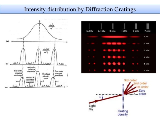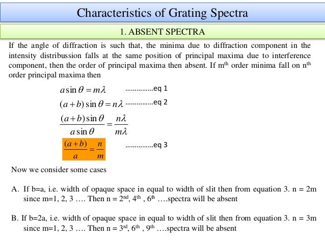 - 23. Characteristics of Grating Spectra If the angle of diffraction is such that, the minima due to diffraction component in the intensity distribussion falls at the same position of principal maxima due to interference component, then the order of principal maxima then absent. If mth order minima fall on nth order principal maxima then m n a ba nba ma sin sin)( sin)( sin m n a ba )( Now we consider some cases A. If b=a, i.e. width of opaque space in equal to width of slit then from equation 3. n = 2m since m=1, 2, 3 …. Then n = 2nd, 4th , 6th ….spectra will be absent B. If b=2a, i.e. width of opaque space in equal to width of slit then from equation 3. n = 3m since m=1, 2, 3 …. Then n = 3rd, 6th , 9th ….spectra will be absent 1. ABSENT SPECTRA ……………eq 1 ……………eq 2 ……………eq 3