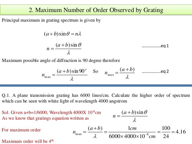 - 24. 2. Maximum Number of Order Observed by Grating Principal maximum in grating spectrum is given by nba sin)( sin)( ba n Maximum possible angle of diffraction is 90 degree therefore o ba n 90sin)( max )( max ba n So Q.1. A plane transmission grating has 6000 lines/cm. Calculate the higher order of spectrum which can be seen with white light of wavelength 4000 angstrom Sol. Given a+b=1/6000, Wavelength 4000X 10-8cm As we know that gratings equation written as For maximum order Maximum order will be 4th sin)( ba n 16.4 24 100 1040006000 1)( 8max cm cmba n ……………..eq 1 ……………..eq 2
