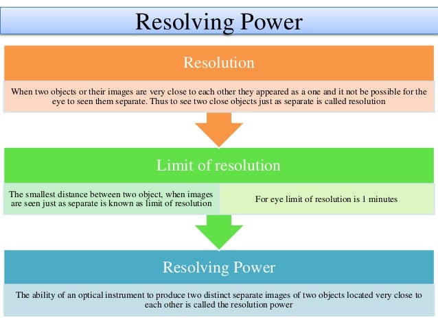 - 28. Resolving Power Resolving Power The ability of an optical instrument to produce two distinct separate images of two objects located very close to each other is called the resolution power Limit of resolution The smallest distance between two object, when images are seen just as separate is known as limit of resolution For eye limit of resolution is 1 minutes Resolution When two objects or their images are very close to each other they appeared as a one and it not be possible for the eye to seen them separate. Thus to see two close objects just as separate is called resolution