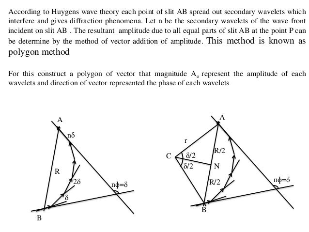 - 5. According to Huygens wave theory each point of slit AB spread out secondary wavelets which interfere and gives diffraction phenomena. Let n be the secondary wavelets of the wave front incident on slit AB . The resultant amplitude due to all equal parts of slit AB at the point P can be determine by the method of vector addition of amplitude. This method is known as polygon method For this construct a polygon of vector that magnitude Ao represent the amplitude of each wavelets and direction of vector represented the phase of each wavelets nɸ=δ δ/2 δ/2 N A B C δ 2δ nδ r nɸ=δ A B R R/2 R/2