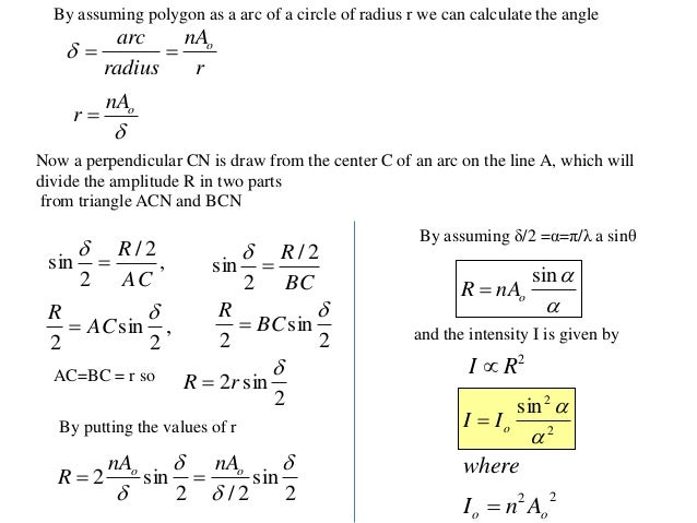 - 6. r nA radius arc o onA r Now a perpendicular CN is draw from the center C of an arc on the line A, which will divide the amplitude R in two parts from triangle ACN and BCN By assuming polygon as a arc of a circle of radius r we can calculate the angle , 2/ 2 sin AC R BC R 2/ 2 sin , 2 sin 2 AC R AC=BC = r so 2 sin 2 BC R 2 sin2 rR 2 sin 2/2 sin2 oo nAnA R By putting the values of r By assuming δ/2 =α=π/λ a sinθ sin onAR and the intensity I is given by 2 RI 2 2 sin oII 22 oo AnI where